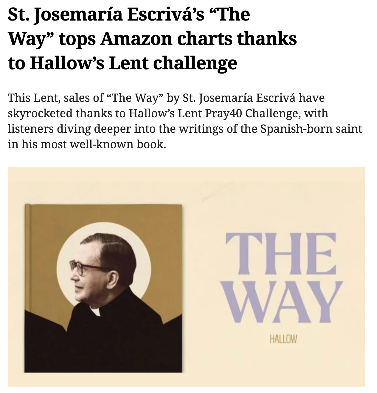 As it soared to new heights of popularity this Lent, the Hallow app featured an unusual book choice for its Lent prayer challenge - The Way, by Josemaria Escriva, founder of Opus Dei. Alex Jones told Aleteia, a Catholic news site, that The Way "has been one of the most impactful books to my own spiritual life and it is a blessing to get to share it with the community on Hallow’. In a video promoting the series, he said: ‘I keep it by my bedside every night.’ Thanks to Hallow’s promotion, the book went to number seven on Amazon.com’s non-fiction charts, as tens of thousands of Americans downloaded it.