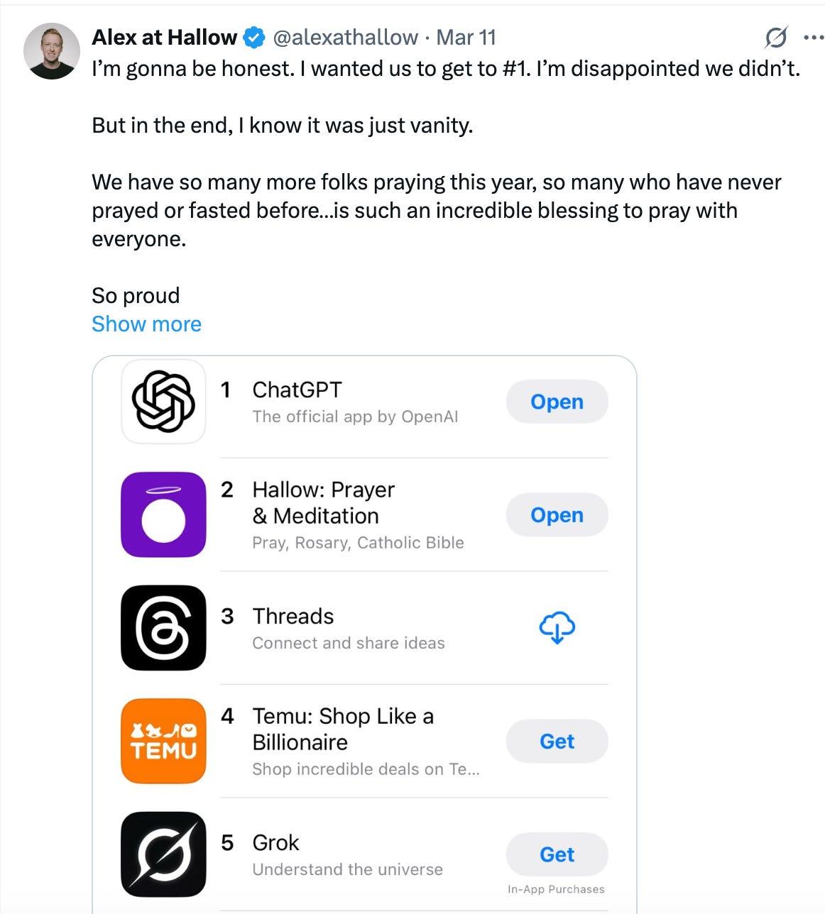 Hallow is a Christian prayer app launched in 2018 by a young American called Alex Jones, with over $100 million in investment from backers including Peter Thiel and JD Vance. It’s kind of ‘Headspace for Christians’ - a wellness app with traditional Christian faith and morality attached, featuring prayers from Christian celebrities like Gwen Stefani and Chris Pratt, and ways to link up to your local Catholic congregation. Its popularity soared last month, after it ran an advert during the Superbowl featuring Mark Wahlberg telling us to Stay Prayed Up. In March it was nearly the top-downloaded app on Apple, behind only ChatGPT.