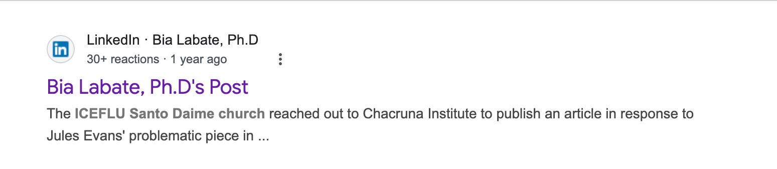Chacruna’s director Bia Labate, who orchestrated the ICEFLU open letter denouncing me, also complained to Doubleblind’s editors about my article, and Doubleblind has not published an article by me since.