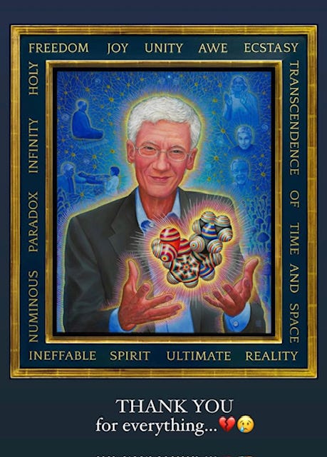 Yet psychedelic science always does seem to lead to religious enthusiasm, both in its researchers and the wider ‘psychedelic community’. The community responded to his death as they did to the passing of Tim Leary or Ram Dass - as the passing of a saint or holy man. That much was noticed by Leary’s son, Zach, who posted: