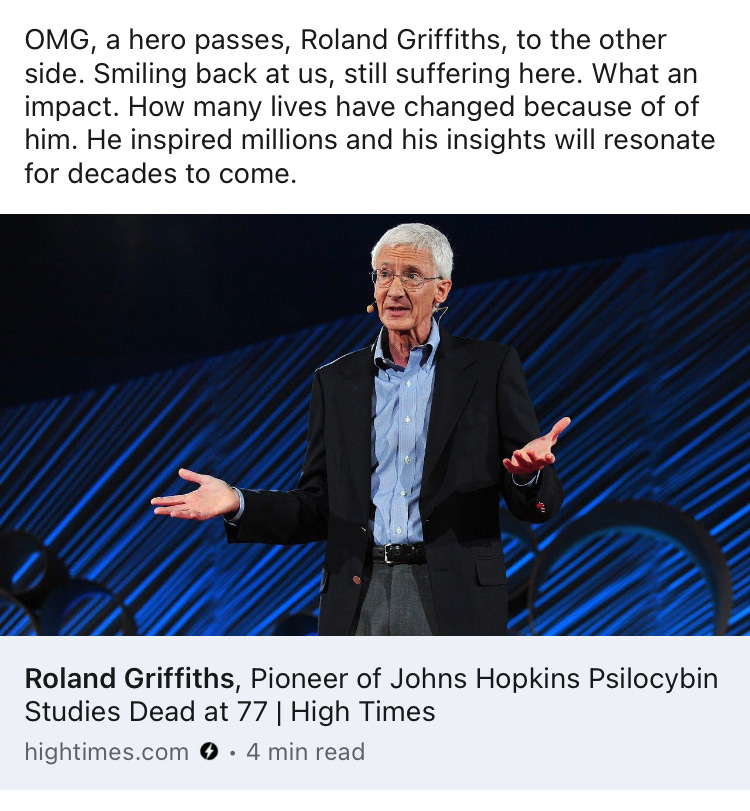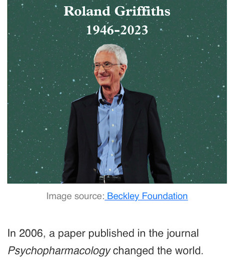 If a stable psychedelic spirituality does emerge, Roland Griffiths will undoubtedly be seen as one of its prophets. And I hope no one minds me discussing some of these points in an obituary. That’s what academic discussion should be, after all - a discussion.