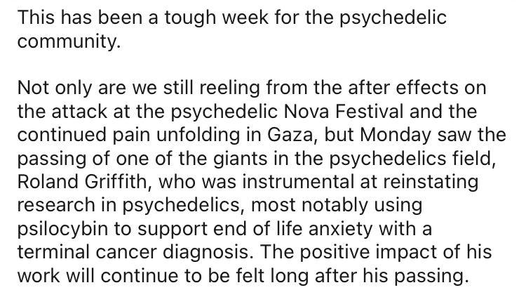 However, Griffiths’ spiritual mission caused some consternation among less spiritually-minded colleagues. It’s an open secret in the psychedelic community that he disagreed with Matthew Johnson, another psychedelic professor at Johns Hopkins. There seem to have been two main reasons - one was due to internal Johns Hopkins politics, which I am not privy to. The other reason was Johnson’s concerns - going back to 2018 - about what he saw as the centre’s promotion of a spiritual vision.