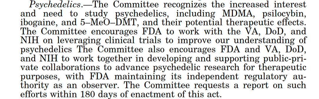 Finally, several other appropriations bills passed this year included language on psychedelic treatments, calling for different federal agencies to spend money advancing the field. For example, the Agriculture, Rural Development, Food and Drug Administration and Related Agencies Appropriations Bill includes this passage:
