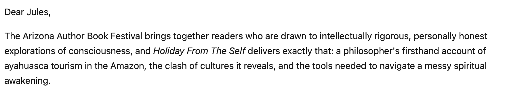 Then a few days later, another email from another successful author, effusing over my last book, Holiday from the Self. Also fake. Then there’s emails from festival organizers - this one had the right name for the festival organizer, and an AI’s glib knowledge of my book, but the message is a scam inviting me to do an interview which I’m guessing would be pay-to-play.