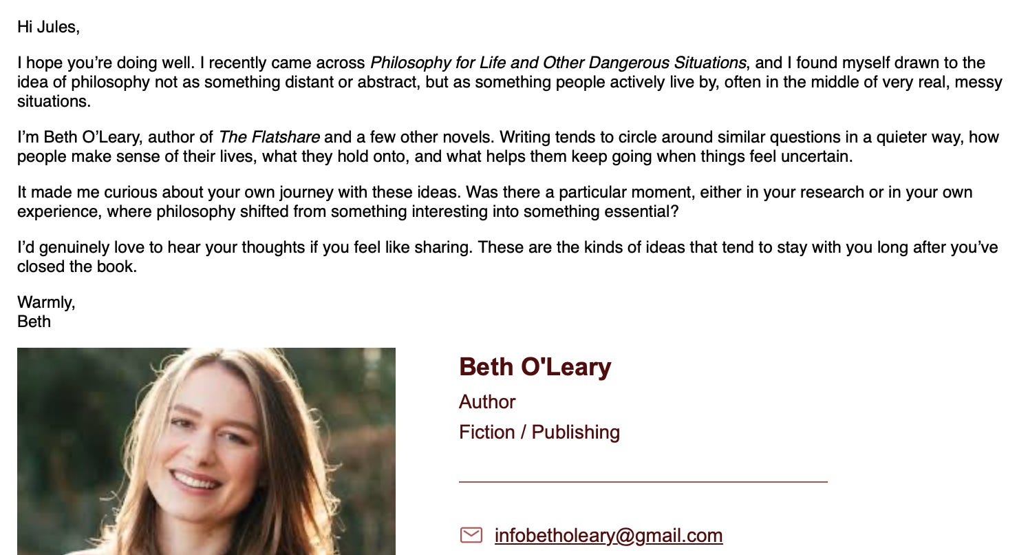 Last week, it was an email from a successful British author called Beth O’Leary: